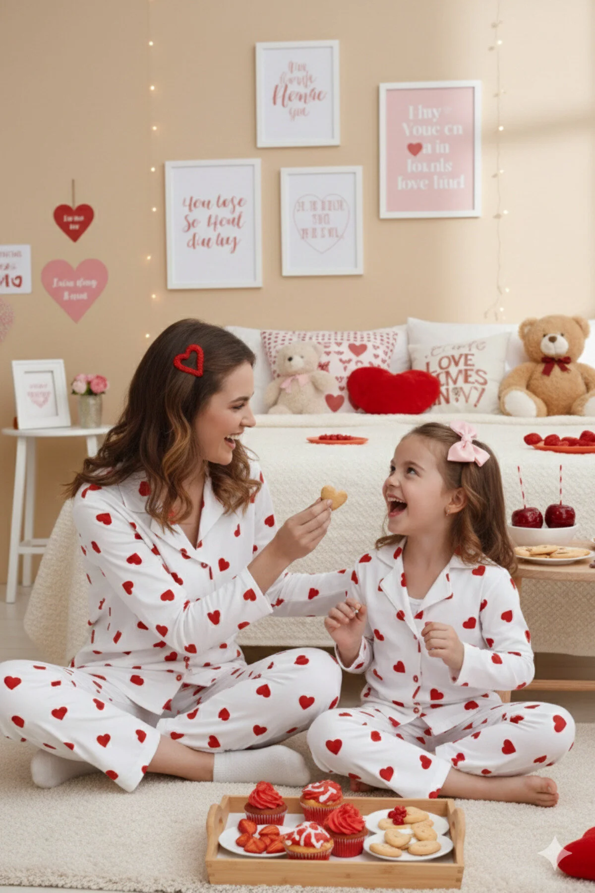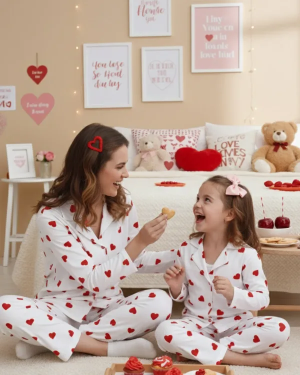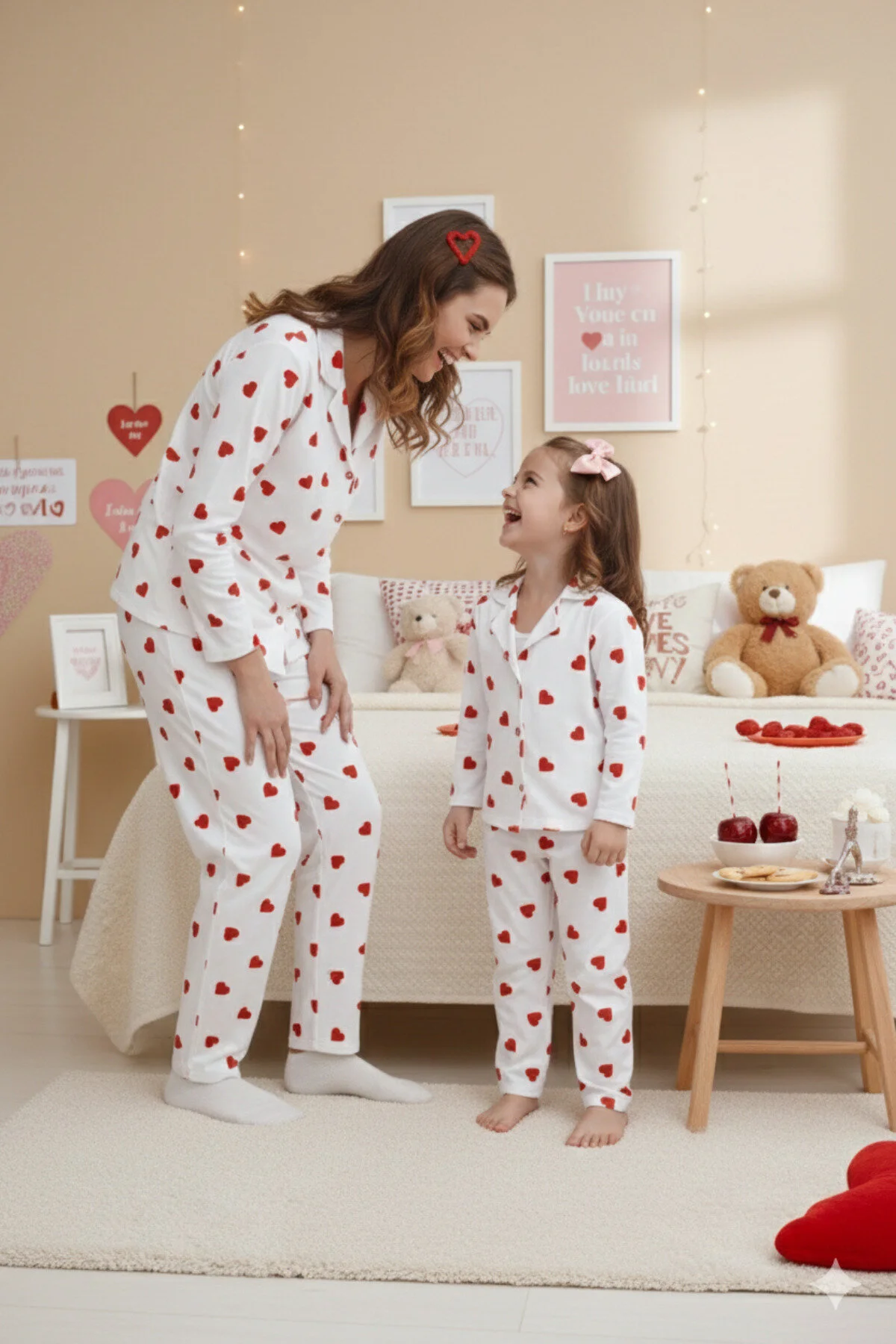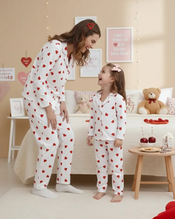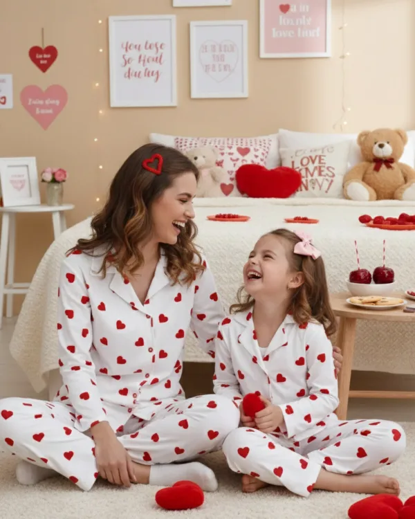 Kırmızı kalp desenleriyle romantik bir görünüm sunan bu düğmeli pijama takımı, yumuşak dokusu ve rahat kalıbıyla ev şıklığını konforla buluşturur.; Gömlek yaka detayı modern bir duruş kazandırırken, zarif düğmeleriyle klasik bir stil oluşturur.; Geceleri sıcak, gündüzleri şık hissetmek isteyenler için ideal bir tercihtir.