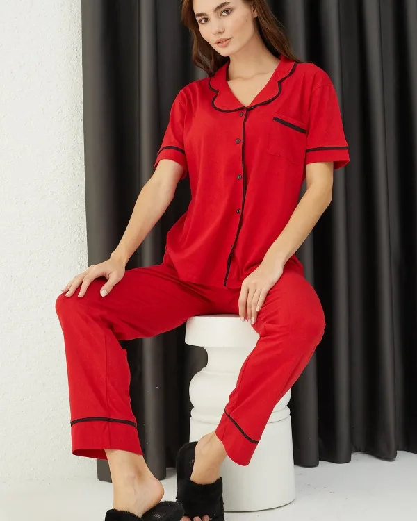 Boru paça tasarımı ile modern ve şık bir görünüm sunar.; Yıkama talimatlarına uygun şekilde bakım yapıldığında uzun süreli dayanıklılık sunar.; Dokuma kumaşı, pijama takımının formunu korumasını ve rahat hareket etmesini sağlar.; Düğme detayları ile hem şık hem de pratik bir kullanım imkanı tanır.; Basic koleksiyonun sadeliğini yansıtan düz tasarım, her gardıropta yerini alabilir.; Regular kalıp, farklı vücut tiplerine uyum sağlayarak konforlu bir deneyim sunar.; Normal bel yüksekliği ve standart kol uzunluğu ile günlük kullanımda maksimum rahatlık sağlar.; Bisiklet yaka kesimi sayesinde sade ve zarif bir duruş sergiler.; Uzun kol boyu, mevsimsel geçişlerde ideal sıcaklık dengesi sunar.; Antrasit rengiyle kolayca kombinlenebilir ve zamansız bir stil oluşturmanızı mümkün kılar.; Lounge/home ortamına uygun olarak tasarlanmıştır; evdeki rahat anlarınızda size eşlik eder.
