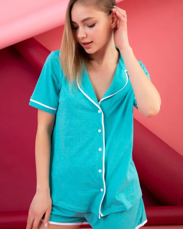 Tüm yaş gruplarına uygun tasarımıyla herkesin rahatlıkla tercih edebileceği bir pijama takımıdır.; Boru paça kesimi sayesinde modern ve şık bir görünüm sunarken, rahat hareket etme olanağı sağlar.; Kolay bakım için belirlenen yıkama talimatlarına uygun şekilde yıkanabilir, böylece uzun süreli kullanım için idealdir.; Bisiklet yaka tasarımı ile hem konforlu hem de sade bir stil sunar; gün boyu rahatlık sağlar.; Standart kol yapısı, kollarınızda herhangi bir baskı hissi olmadan hareket etmenizi destekler.; Regular kalıp, vücut hatlarınıza uyum sağlayarak rahat bir oturuş sağlar ve şık görünümünüzden ödün vermezsiniz.; Büyük beden seçeneğiyle her bedene hitap ederken, büyük boyutlarda bile konforlu bir deneyim vaat eder.; Kısa kol boyu yaz ayları için idealdir; serin tutarken şıklığınızdan taviz vermezsiniz.; Düz renk tasarımı ve deseniyle zamansız bir tarz yaratır; farklı aksesuarlarla kolayca kombinlenebilir.; Örme kumaşı esnekliği artırarak pijamanızı giymeyi kolaylaştırırken dayanıklılığı da arttırır.