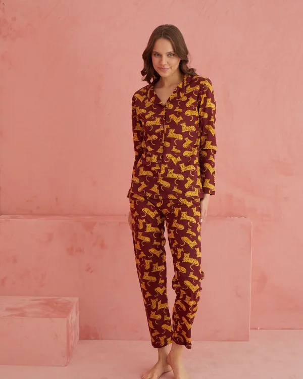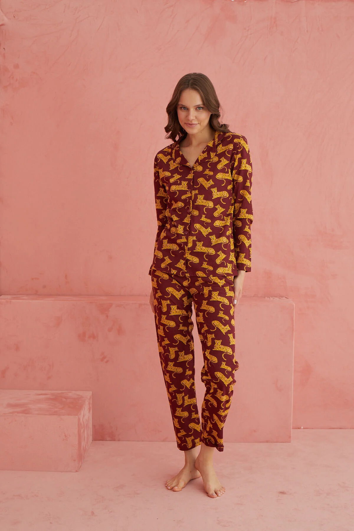 Zarifliğin ve konforun buluştuğu bu %100 pamuk kumaş önden düğmeli kadın pijama takımı, yumuşacık dokusuyla evinizdeki rahatlığı bir üst seviyeye taşıyor.; Modelin 1.70 boy, 47 kilo ölçüleri ve S/36 beden seçenekleri ile kusursuz bir uyum sağlayan bu takım, rahat bir kalıba sahip.; Gömlek yaka ve önden düğmeli üstü, uzun kollu tasarımıyla pratik kullanım sunuyor.; Hassas yıkama tavsiyesiyle uzun ömürlü kullanımı hedefleyen pijama takımı, kurutma makinesi yerine doğal kurutma yöntemleriyle daha uzun kullanım ömrü sunar.; Bu önden düğmeli pijama takımı, her kadının dolabında yer alması gereken modern ve şık bir parçadır.; Bu ürün ” Eliz ” etiketi ile gönderilmektedir.