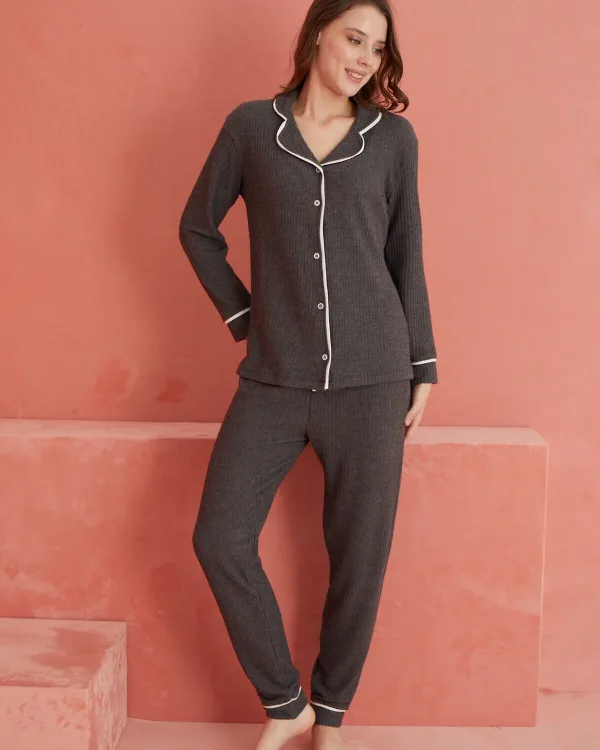 Modelin Ölçüleri: Boy: 1.67, Kilo: 45, Göğüs: 82, Bel: 60, Kalça: 86. Basic silueti ile rahat ve sade bir görünüm sunar, evde konforlu zaman geçirmek için idealdir.; %100 tekstil materyal bileşeni sayesinde yumuşak dokusuyla cildinize nazikçe dokunur ve rahat bir uyku deneyimi sağlar.; Uzun paça boyu, bacaklarınızı sıcak tutarken şık bir görünüm kazandırır.; İki parçadan oluşan set, hem gömlek hem de pantolon olmak üzere tam bir pijama takımını tek pakette sunar.; Lounge ve ev ortamına uygun tasarımıyla evde geçirilen zamanları daha keyifli hale getirir.; Homewear koleksiyonunun parçası olarak ev giyimine özel olarak tasarlanmıştır.; Bu ürün ” Eliz ” etiketi ile gönderilmektedir.
