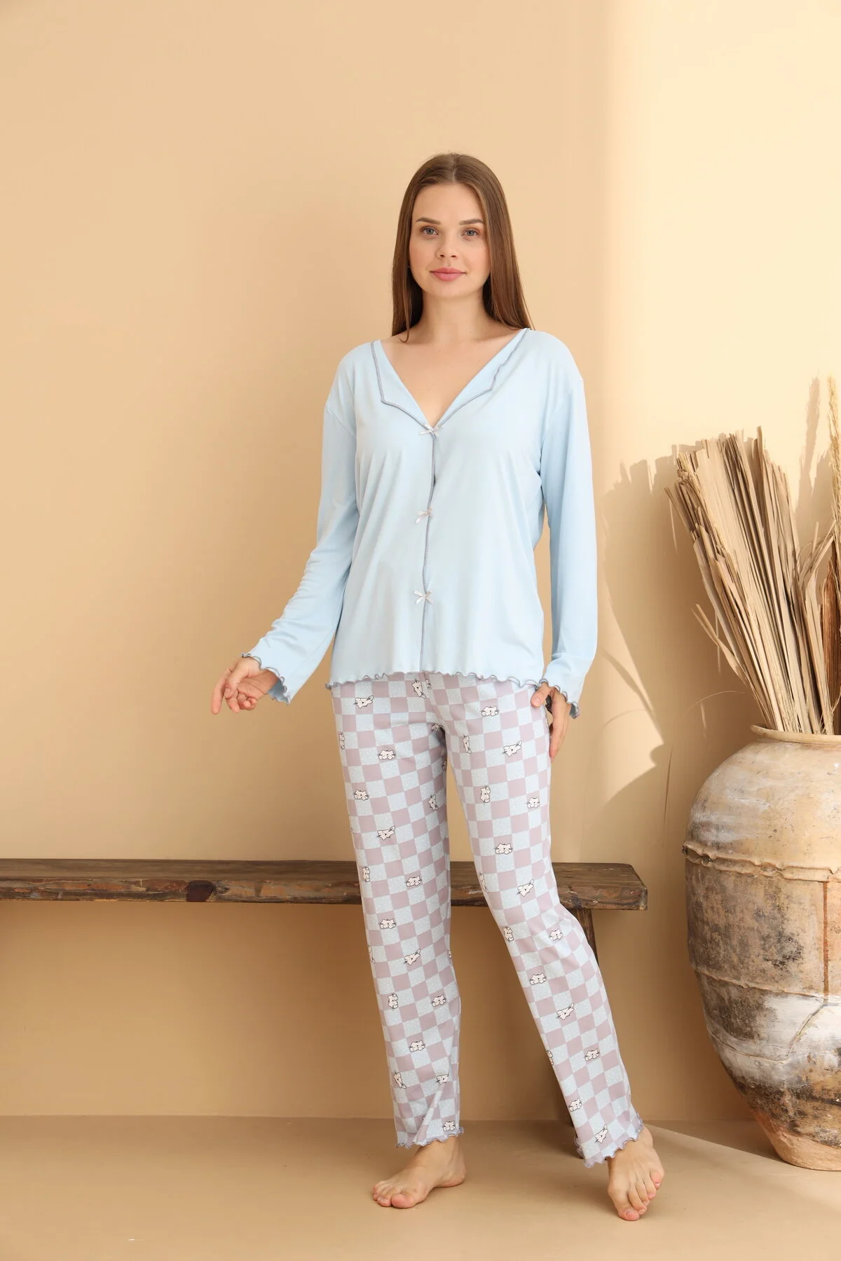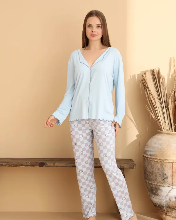 Zarif tasarımı ve rahat kalıbıyla Mavi Kare Desenli Kadın Pijama Takımı, ev giyiminin vazgeçilmez parçası olmaya aday.; Yumuşak dokulu, nefes alan kumaşıyla dört mevsim kullanıma uygundur.; Kare desenli alt parçası ve sade üst tasarımıyla hem şık hem de konforlu bir görünüm sunar.