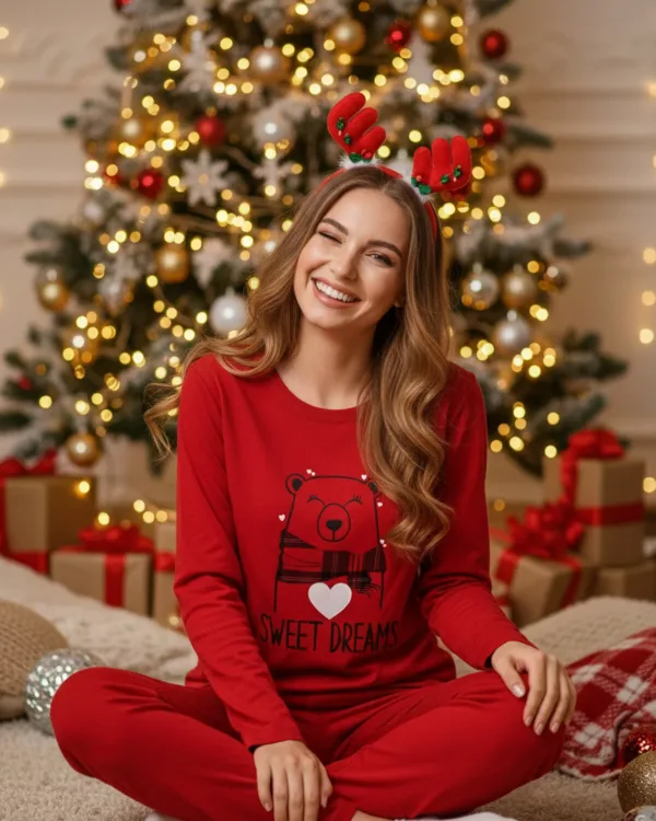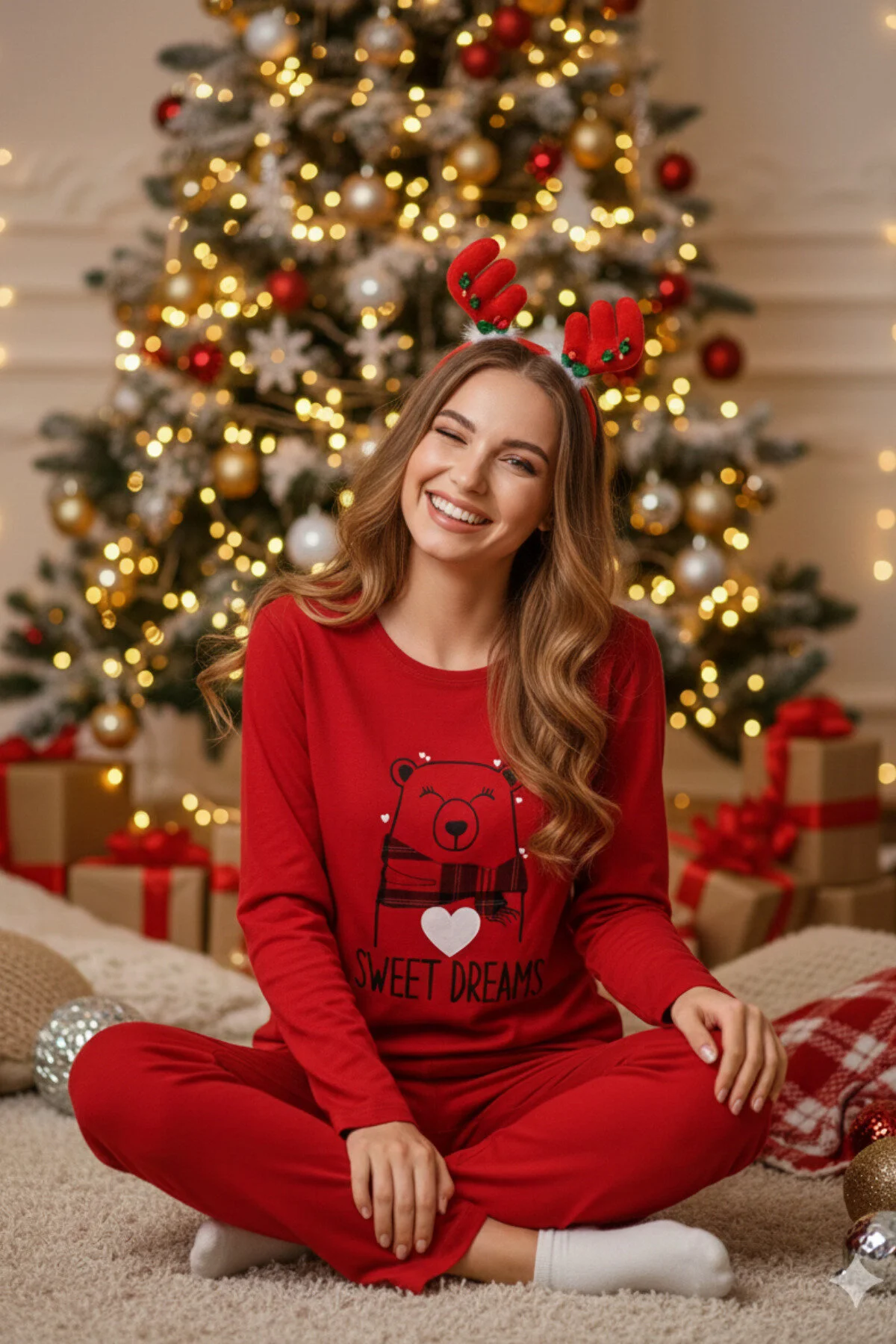 Pamuklu İnterlok Ayıcık Baskılı Pijama Takımı, yumuşak dokusu ve nefes alabilen pamuklu interlok kumaşı sayesinde gün boyu ve uyku sırasında konforlu bir kullanım sunar; uzun kollu üst parçası sevimli ayıcık ve kalp detaylı baskısıyla sıcak ve keyifli bir görünüm kazandırırken, uzun paçalı alt parçası esnek bel yapısı sayesinde vücudu sıkmadan rahat bir uyum sağlar ve ev giyimi ile uyku için ideal bir tercih oluşturur.