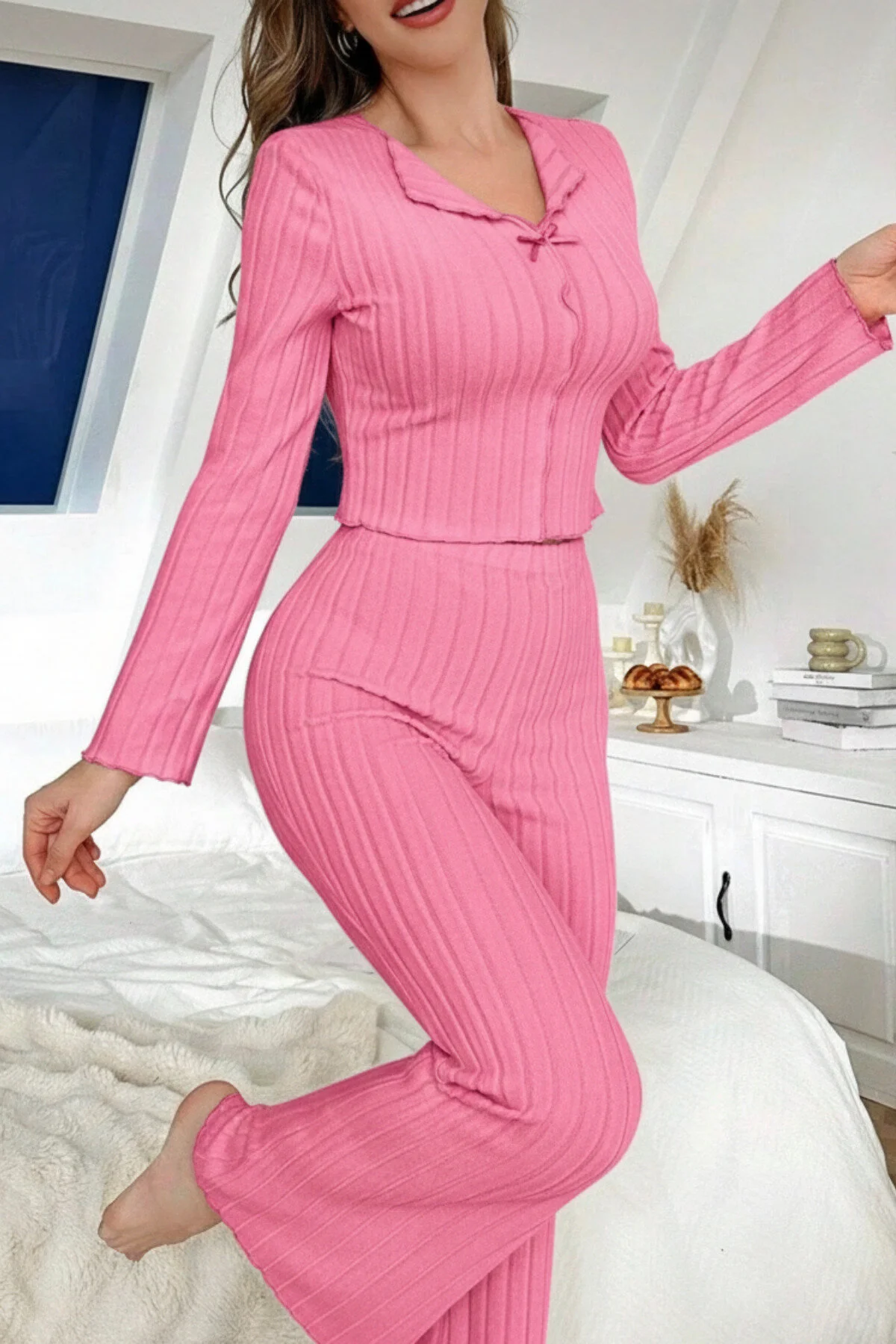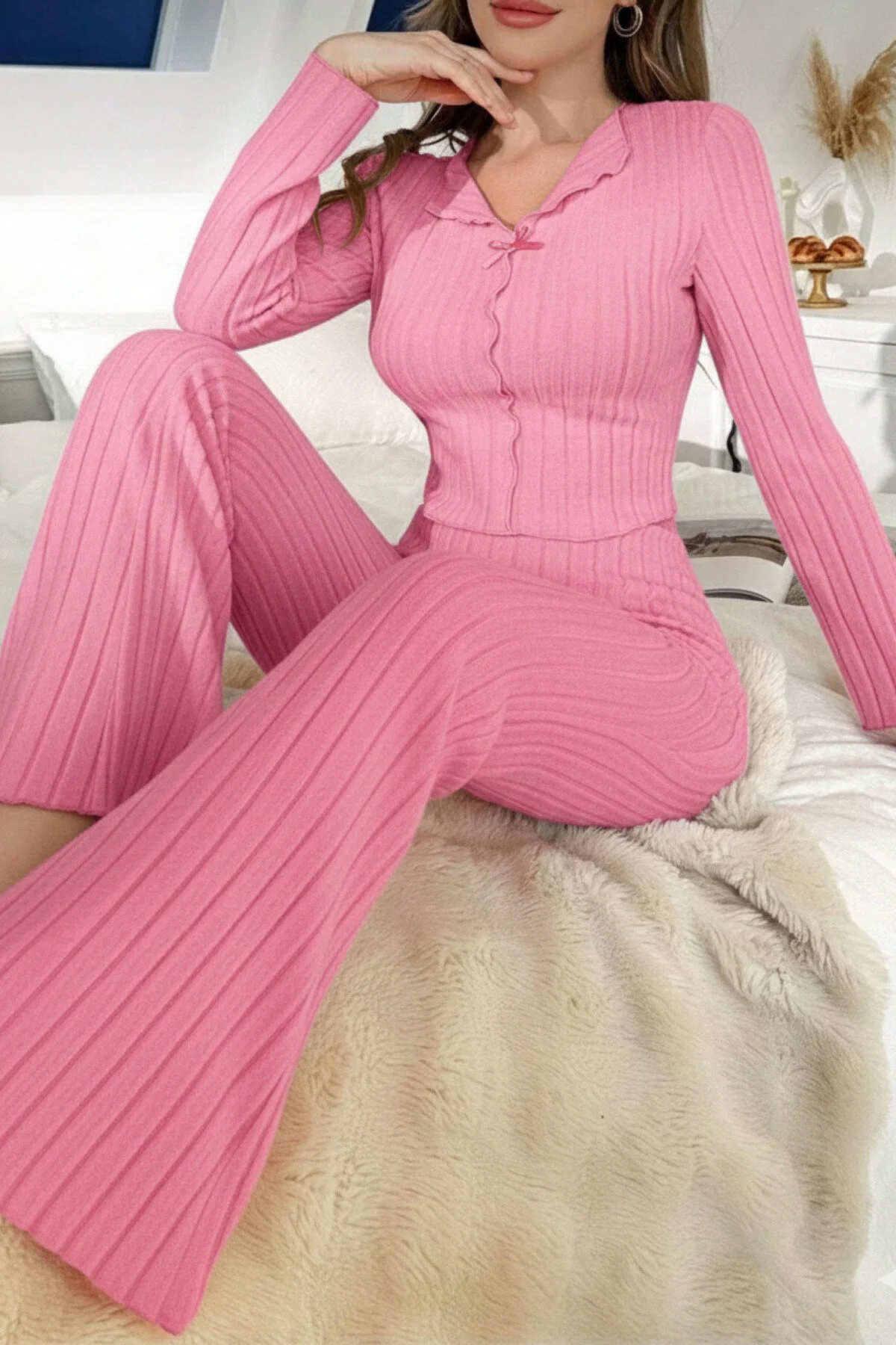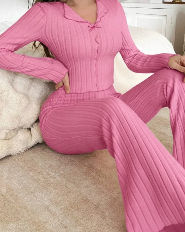 Yumuşacık dokusu ve zarif formu ile ev konforunu zarafetle buluşturan bu takım, dinlenme anlarınıza modern bir dokunuş katarken ince çizgi detaylarıyla vücuda zarifçe oturur ve esnek yapısı sayesinde gün boyu rahatlık sunar; özenle tasarlanmış düğme kısmındaki minik fiyonk detayları feminen bir hava kazandırırken dökümlü paça kesimiyle zarif bir siluet oluşturur ve evde keyifli vakit geçirirken kendinizi hem konforlu hem de bakımlı hissetmeniz için tasarlanmıştır.