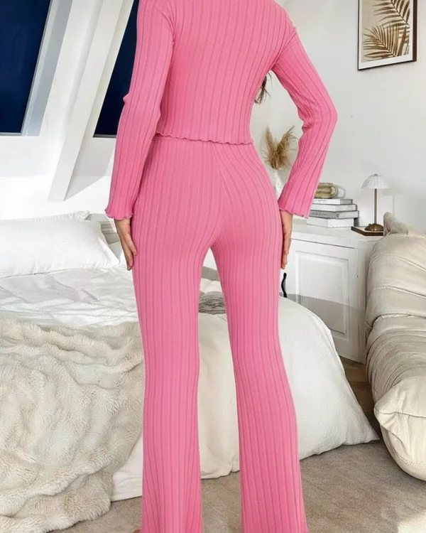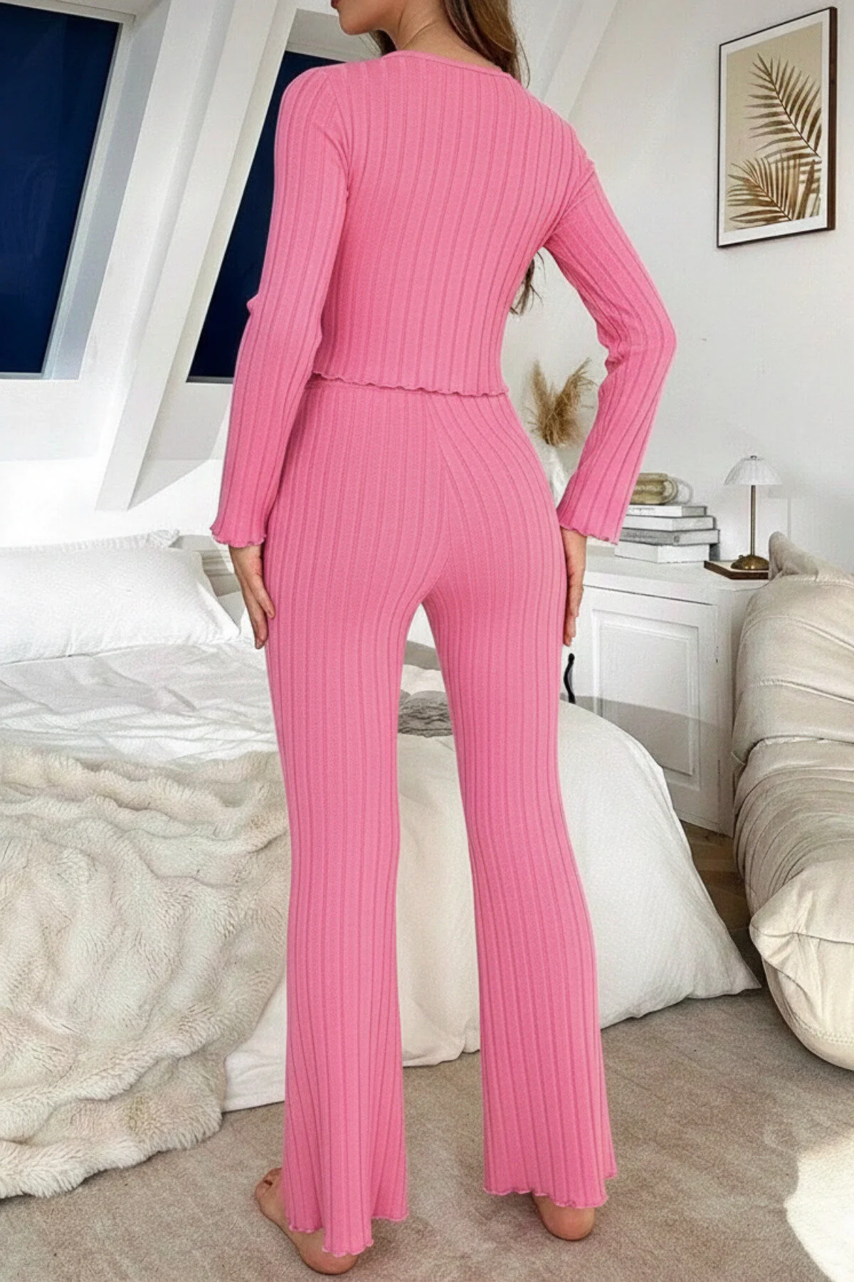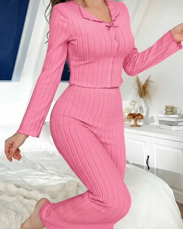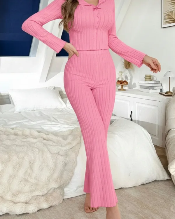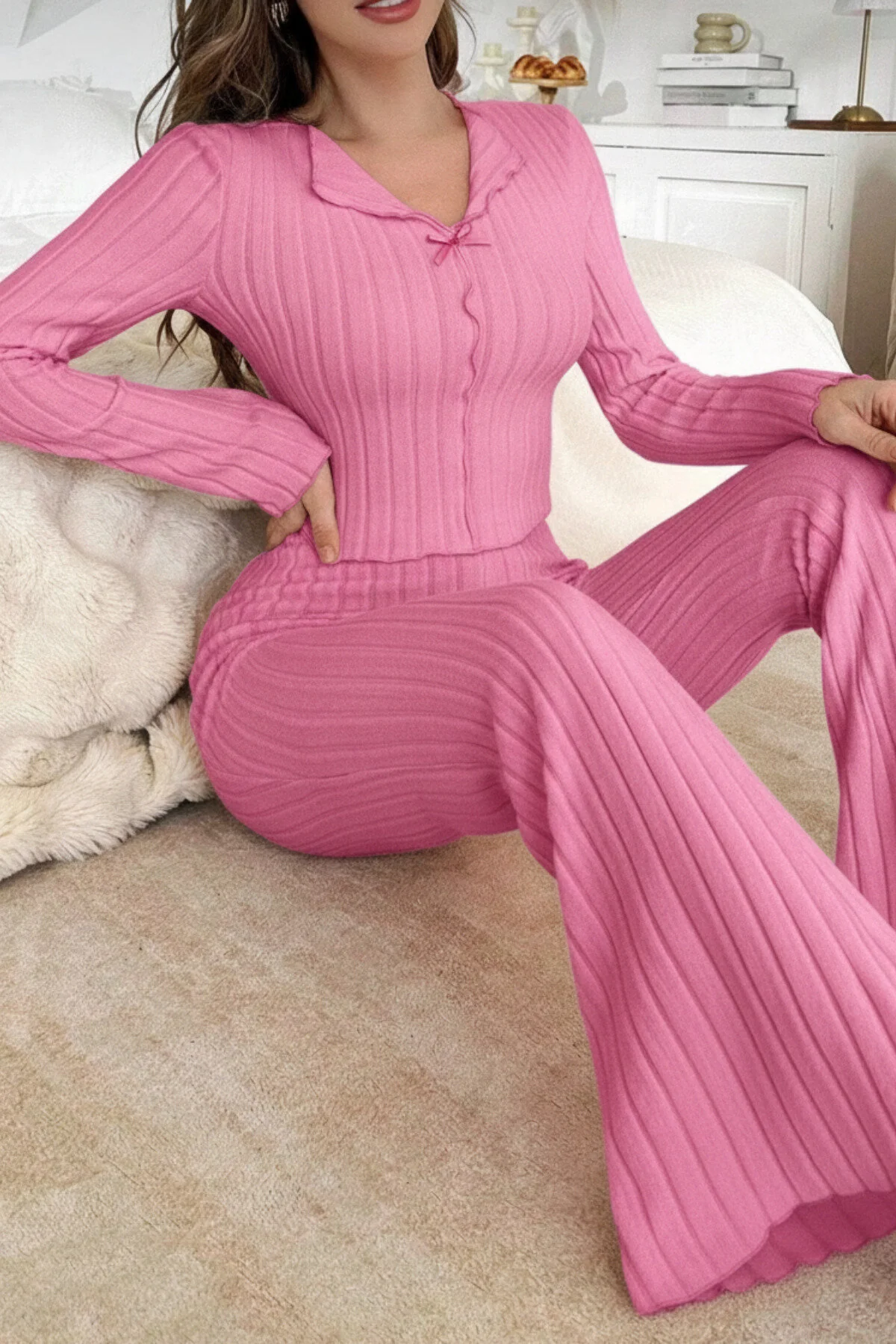 Yumuşacık dokusu ve zarif formu ile ev konforunu zarafetle buluşturan bu takım, dinlenme anlarınıza modern bir dokunuş katarken ince çizgi detaylarıyla vücuda zarifçe oturur ve esnek yapısı sayesinde gün boyu rahatlık sunar; özenle tasarlanmış düğme kısmındaki minik fiyonk detayları feminen bir hava kazandırırken dökümlü paça kesimiyle zarif bir siluet oluşturur ve evde keyifli vakit geçirirken kendinizi hem konforlu hem de bakımlı hissetmeniz için tasarlanmıştır.