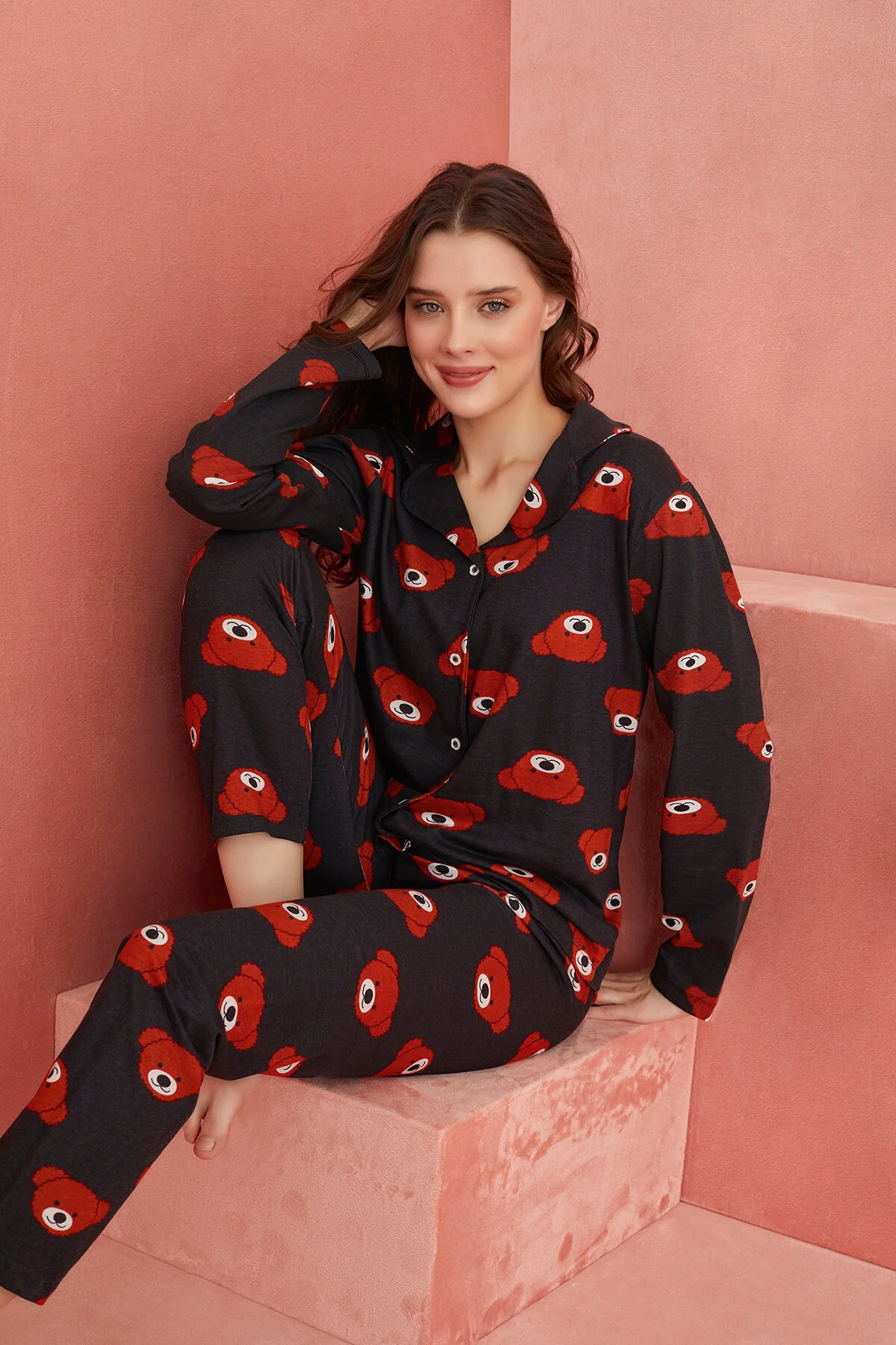 Desenli Uzun Kollu Örme Önden Düğmeli Pijama Takım