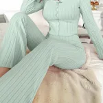 Yeşil Raporlu Waffle Örme Uzun Kol Kadın Pijama Takımı